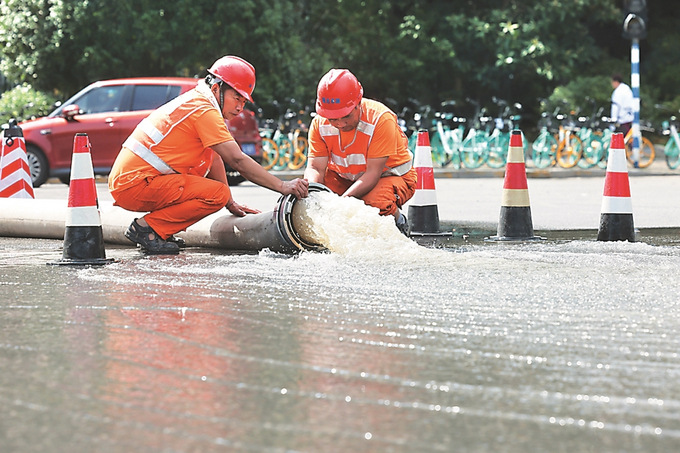 二十四日,南京市鼓樓區(qū)水務(wù)局工作人員在集賢路操作排水泵車清除積水,恢復(fù)道路正常通行。本報(bào)記者 陳儼 攝
