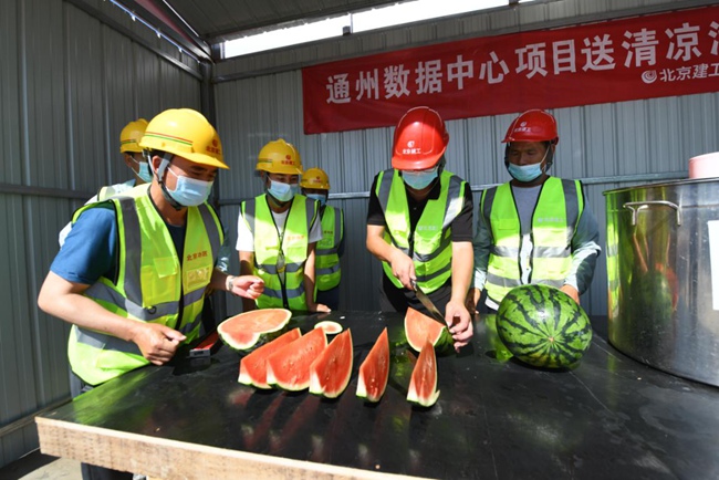 在通州數(shù)據(jù)中心項目頂板鋪設(shè)施工現(xiàn)場,高溫對奮戰(zhàn)在施工一線的員工來說無疑是一場巨大的“烤驗(yàn)”?!半m然現(xiàn)場的溫度達(dá)到了38℃,但是項目部合理調(diào)配時間,對現(xiàn)場的防暑降溫工作做了全面部署,施工現(xiàn)場配備了西瓜、綠豆湯、藿香正氣水和清涼油等防暑物資,在場邊設(shè)置了遮陽涼棚,并且讓施工人員避開上10點(diǎn)到下午3點(diǎn)的高溫期錯時上崗,保證現(xiàn)場安全生產(chǎn)的同時也盡量不耽誤項目進(jìn)度?!表椖坎控?fù)責(zé)人胡永忠說。