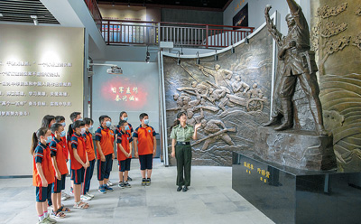 7月6日,在江蘇省泰興市新街鎮(zhèn)楊村廟烈士紀(jì)念館,少先隊(duì)員在宣泰戰(zhàn)斗浮雕前聽講解員講解。顧繼紅攝(影像中國)