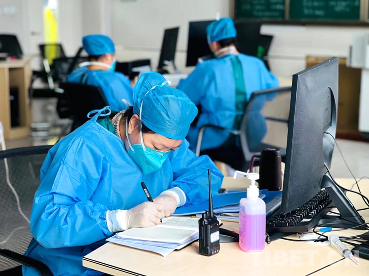 圖為拉薩市第二座方艙醫(yī)院護(hù)理隊(duì)隊(duì)長央宗在記錄一天的重點(diǎn)工作 攝影:次仁卓瑪