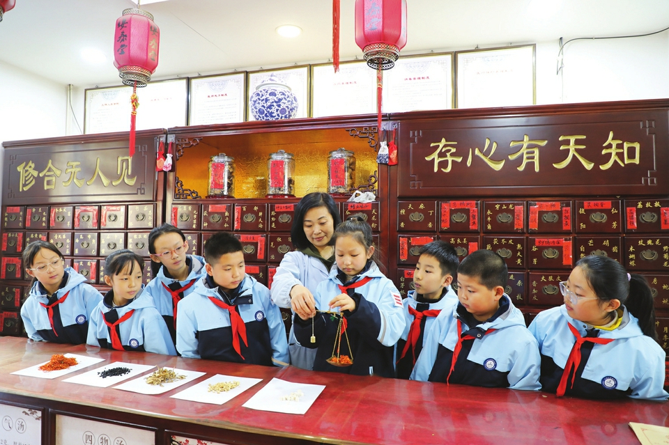 12月7日,陽泉市城區(qū)小陽泉北社區(qū)黨委聯(lián)合陽泉市實(shí)驗(yàn)小學(xué),開展了“學(xué)習(xí)草藥知識(shí)、感受中醫(yī)魅力”課外實(shí)踐活動(dòng)。孩子們來到藥店,通過識(shí)別中草藥、稱量、加工中草藥材等具體活動(dòng),近距離體驗(yàn)中醫(yī)藥傳統(tǒng)文化特色,感受中醫(yī)藥魅力。圖為孩子們在藥劑師的指導(dǎo)下稱量中草藥。(張春林?jǐn)z)