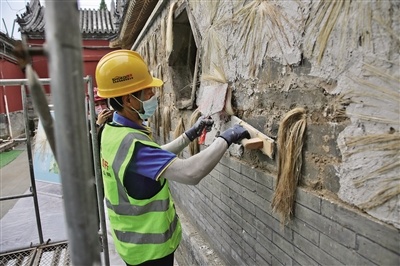 2021年9月16日,萬(wàn)壽寺二期修繕工地,工人正在對(duì)墻體進(jìn)行修繕。新京報(bào)記者 鄭新洽 攝