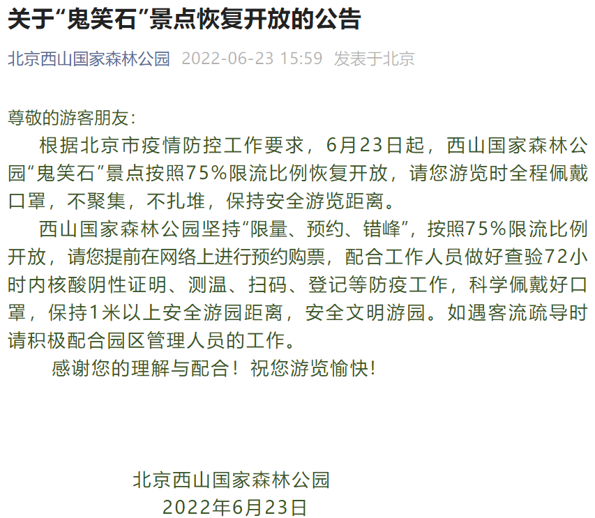 央廣網(wǎng)北京6月23日消息 據(jù)北京西山國(guó)家森林公園微信公眾號(hào)消息,根據(jù)北京市疫情防控工作要求,自6月23日起,西山國(guó)家森林公園“鬼笑石”景點(diǎn)按照75%限流比例恢復(fù)開放。