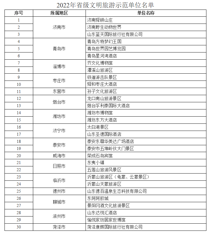 山東省認(rèn)定30家單位為2022年省級(jí)文明旅游示范單位