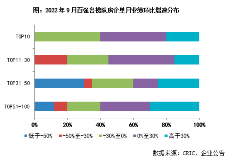 具體從企業(yè)表現(xiàn)來(lái)看,克而瑞報(bào)告顯示,2022年9月超半數(shù)百?gòu)?qiáng)房企實(shí)現(xiàn)單月業(yè)績(jī)環(huán)比增長(zhǎng),其中30家企業(yè)的環(huán)比增幅在0%到30%之間,25家企業(yè)環(huán)比增幅超過30%。如華潤(rùn)、招商、綠地、越秀、仁恒等企業(yè)的環(huán)比增幅均在35%以上。但從業(yè)績(jī)同比來(lái)看,目前規(guī)模房企整體仍深陷負(fù)增長(zhǎng)困局,9月單月業(yè)績(jī)同比降低的企業(yè)數(shù)量達(dá)到近7成,僅3成企業(yè)實(shí)現(xiàn)了單月業(yè)績(jī)同比增長(zhǎng)。
