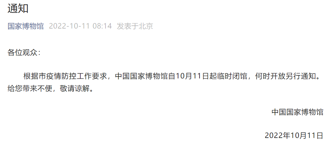 央廣網北京10月11日消息 據國家博物館官方微信公眾號消息,根據北京市疫情防控工作要求,中國國家博物館自10月11日起臨時閉館,何時開放另行通知。