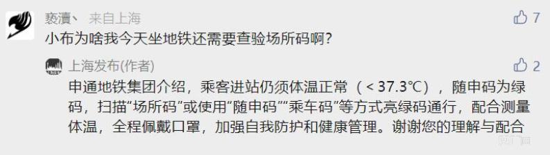 “上海發(fā)布”微信公眾號回復(fù)稱,乘客進站仍須體溫正常(<37.3℃),隨申碼為綠碼,掃描“場所碼”或使用“隨申碼”“乘車碼”等方式亮綠碼通行,配合測量體溫,全程佩戴口罩,加強自我防護和健康管理。