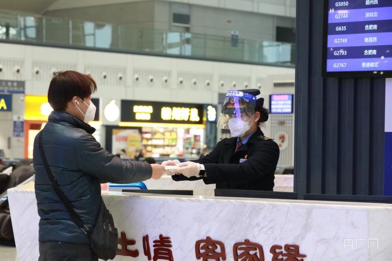 贛州西站服務(wù)臺(tái)為旅客提供口罩(央廣網(wǎng)發(fā) 鄒陽(yáng) 攝)