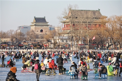 2月4日,什剎海冰場,游客在冰上游玩。2月5日,頤和園、北海公園、陶然亭公園、龍?zhí)吨泻珗@、圓明園遺址公園和什剎海關停冰場。新京報記者 王嘉寧 攝