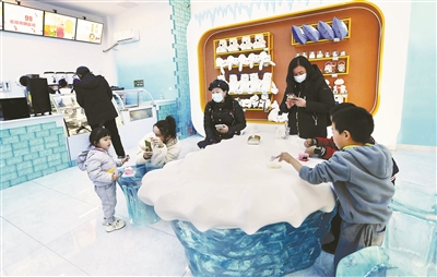 在觀摩體驗(yàn)區(qū),游客可以觀看有趣的制冰過(guò)程。游客熱衷在拍照打卡區(qū)和白熊雕塑合影,留下一段美好的記憶。在周邊商品展示區(qū),各類(lèi)周邊商品陳列于此,供游客朋友挑選采購(gòu)。