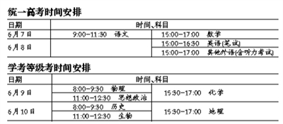 學(xué)考等級考科目為思想政治、歷史、地理、物理、化學(xué)、生物6門,由考生自主選擇3門參加考試,考試時間為6月9日至10日。