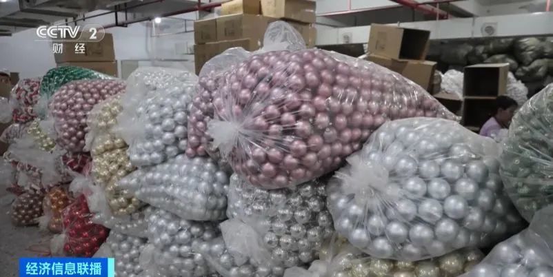 在義烏一家生產(chǎn)圣誕球的企業(yè)里,工人們忙著把剛剛組裝完的成品運往倉庫。負責人告訴記者,今年他們的訂單同比增長30%左右。