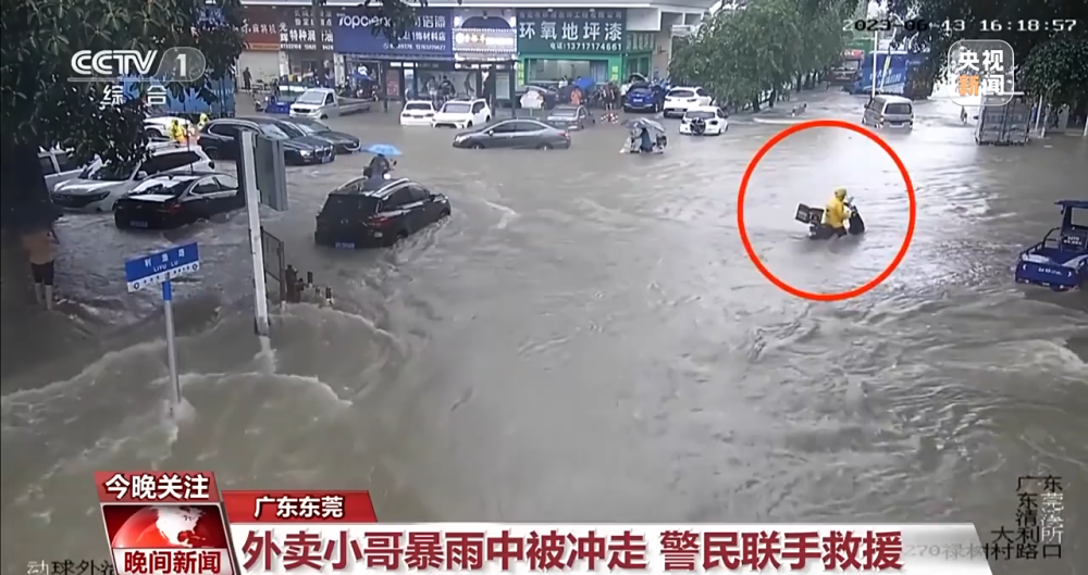 廣東東莞:外賣(mài)小哥暴雨中被沖走 警民聯(lián)手救援