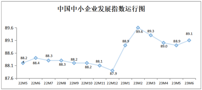 中國中小企業(yè)協(xié)會今天(10日)發(fā)布,隨著推動經(jīng)濟回暖向好的政策措施持續(xù)發(fā)力生效,我國經(jīng)濟總體保持恢復態(tài)勢,中小企業(yè)發(fā)展指數(shù)止跌回升。6月中國中小企業(yè)發(fā)展指數(shù)(SMEDI)為89.1,比上月上升0.2點,結束連續(xù)3個月下降態(tài)勢,且高于2022年同期水平。