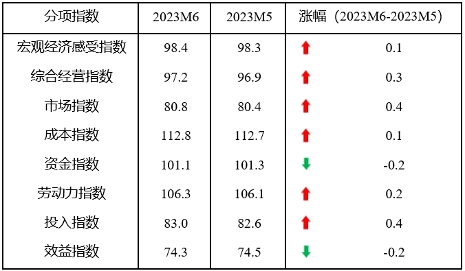 從分項指數(shù)看,6月份,8個分項指數(shù)6升2降,宏觀經(jīng)濟感受指數(shù)、市場指數(shù)、成本指數(shù)和投入指數(shù)止跌回升,綜合經(jīng)營指數(shù)由平轉升,勞動力指數(shù)連續(xù)兩個月上升,資金指數(shù)和效益指數(shù)由升或平轉降。