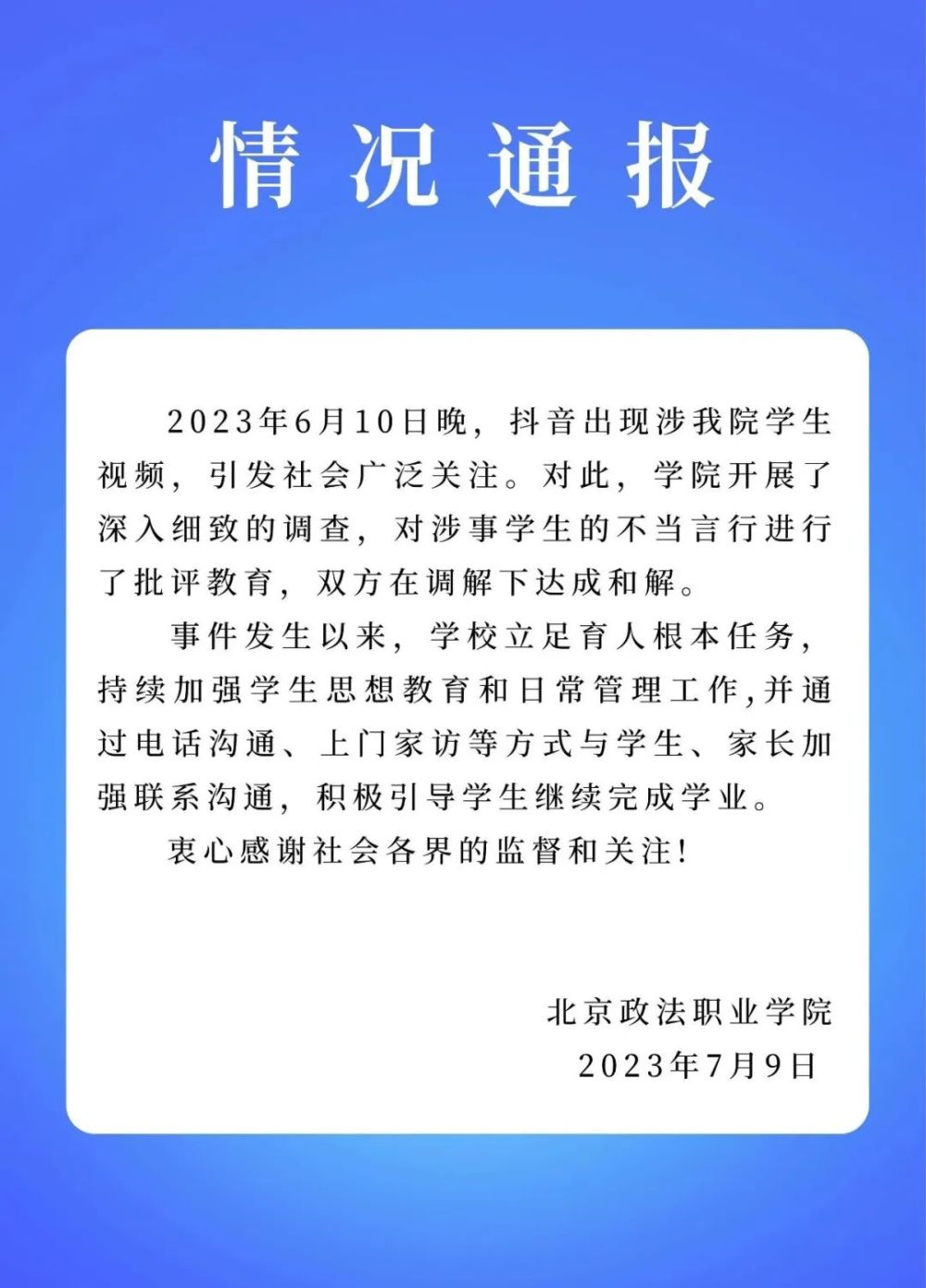 同時,據(jù)北京政法職業(yè)學(xué)院,6月10日晚,抖音出現(xiàn)涉該院學(xué)生視頻,引發(fā)社會廣泛關(guān)注。對此,學(xué)院開展了深入細致的調(diào)查,對涉事學(xué)生的不當(dāng)言行進行了批評教育,雙方在調(diào)解下達成和解。