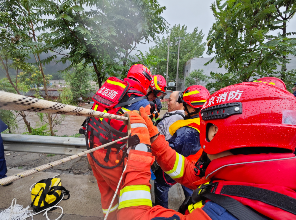 13時(shí)許,在房山區(qū)青龍湖鎮(zhèn)救援安置了少年軍?;乇焕藛T后,北京消防特勤支隊(duì)的救援人員又接到報(bào)警稱,在距離此處9公里外的漫水河水文站有人員被困,現(xiàn)場指揮員立刻分派力量前往現(xiàn)場進(jìn)行救援。