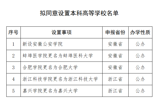 根據(jù)《中華人民共和國高等教育法》《普通高等學(xué)校設(shè)置暫行條例》《普通本科學(xué)校設(shè)置暫行規(guī)定》有關(guān)規(guī)定以及第八屆全國高等學(xué)校設(shè)置評議委員會考察評議結(jié)果,經(jīng)教育部黨組會議審議,擬同意設(shè)置安徽公安學(xué)院等5所學(xué)校,現(xiàn)予公示。公示時(shí)間為2023年11月20日至11月24日。