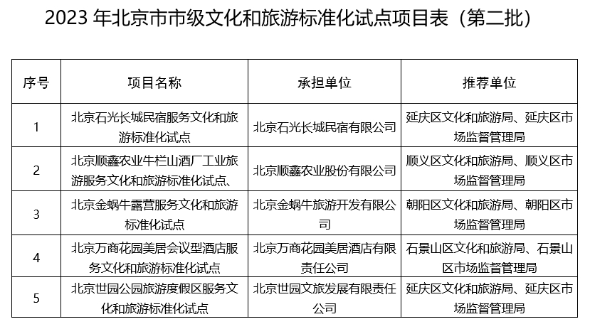 2023年北京市市級文化和旅游標(biāo)準(zhǔn)化試點項目表(第二批):