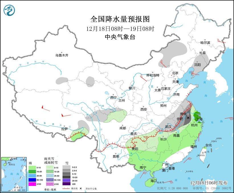 12月18日08時至19日08時,內(nèi)蒙古中東部、吉林南部、遼寧中東部、西藏東部、青海南部、甘肅河西、西南地區(qū)東南部、江漢東部、江淮、江南北部等地的部分地區(qū)有小雪或雨夾雪,其中,安徽中東部、江蘇中西部等地的部分地區(qū)有中到大雪(5~7毫米)。江南大部、華南北部等地的部分地區(qū)有小到中雨。內(nèi)蒙古中西部、黑龍江東南部、遼東半島等地的部分地區(qū)有4~6級風(fēng),西藏北部的部分地區(qū)有7~8級風(fēng)(見圖3)。