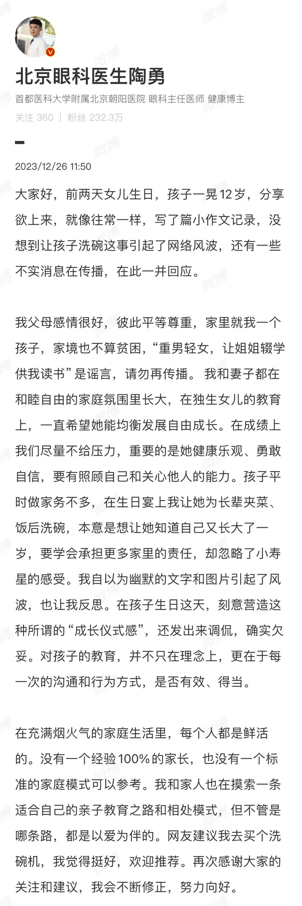 12月23日,陶勇醫(yī)生在微博分享了與12歲女兒的相處日常,文中講到生日這天,女兒拍照不配合。要求女兒在給長輩盛飯夾菜之后,陶勇還希望女兒可以洗碗。在家里人勸阻之后,陶勇還是說動(dòng)女兒洗了碗。陶勇為此心里高興,于是發(fā)文分享此事。