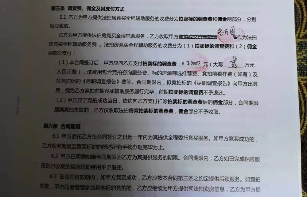 最終,中介口中30萬(wàn)出頭就可以拿下的房子,被加價(jià)到了39萬(wàn),李先生放棄了競(jìng)拍。他算了一筆賬,按最終成交價(jià)再加上各種費(fèi)用,這套法拍房不低于同戶型的二手房?jī)r(jià)格。房子沒(méi)拍到,之前交的兩萬(wàn)元“調(diào)查費(fèi)”也打了水漂。在李先生給記者提供的雙方合同中,有這樣的約定:“合同期限內(nèi),擬競(jìng)拍標(biāo)的《盡職調(diào)查報(bào)告》向甲方出具后,視為乙方競(jìng)拍前期競(jìng)買輔助服務(wù)履行完畢,前期拍賣標(biāo)的‘調(diào)查費(fèi)’不予退還”。
