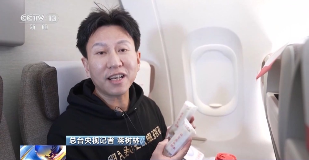 總臺(tái)央視記者 蔣樹(shù)林:首先是這個(gè)大白兔的紅豆風(fēng)味的牛奶,這還是我頭一次看到這樣的口味。還有這個(gè)桂花條頭糕,是上海老字號(hào)出產(chǎn)的。可以說(shuō)這個(gè)小小的餐盤(pán)把上海的土特產(chǎn),搬到了C919飛機(jī)上。