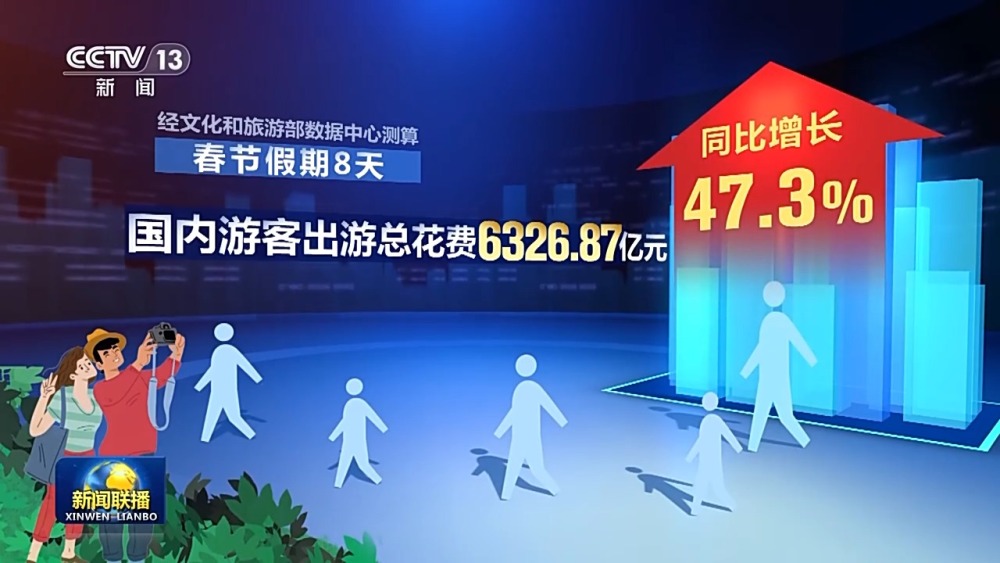 今年這個(gè)春節(jié),人們走得更遠(yuǎn),游玩時(shí)間更長(zhǎng)。出行平臺(tái)分析訂單數(shù)據(jù)后發(fā)現(xiàn),假期里,超過(guò)一半的人選擇跨省出游,其中三成以上的人選擇兩個(gè)及以上目的地,中國(guó)游客出境目的地覆蓋全球1700多個(gè)城市,個(gè)性化出游、定制化消費(fèi)成為新趨勢(shì)。在陜西景區(qū)里看一場(chǎng)沉浸式演出,游客既是觀眾,又是演員,全新消費(fèi)體驗(yàn)帶來(lái)上億元演出收入;四川把火鍋文化和特色觀光結(jié)合在一起,帶動(dòng)特色餐飲消費(fèi)熱度不斷。節(jié)日里,滕王閣景區(qū)北園向公眾開(kāi)放,通過(guò)濱江水道,游客可以直接穿行老城區(qū)的商鋪。經(jīng)文化和旅游部數(shù)據(jù)中心測(cè)算,春節(jié)假期八天,全國(guó)國(guó)內(nèi)旅游出游4.74億人次,同比增長(zhǎng)34.3%,國(guó)內(nèi)游客出游總花費(fèi)6326.87億元,同比增長(zhǎng)47.3%。