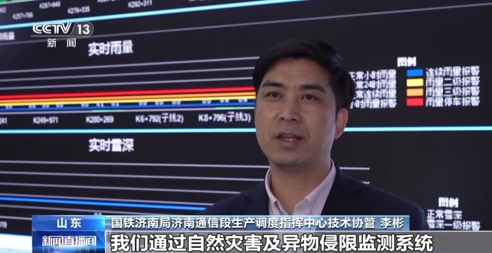 國鐵濟南局濟南通信段生產(chǎn)調(diào)度指揮中心技術協(xié)管 李彬:我們通過自然災害及異物侵限監(jiān)測系統(tǒng),對轄區(qū)內(nèi)6000多公里鐵路線路、天氣、路況進行分析。當監(jiān)測點每小時降水量超過20毫米或瞬時風力達到15米每秒、累計雪深超過50毫米時,系統(tǒng)會自動發(fā)出告警信息,指導列車限速、降速運行。