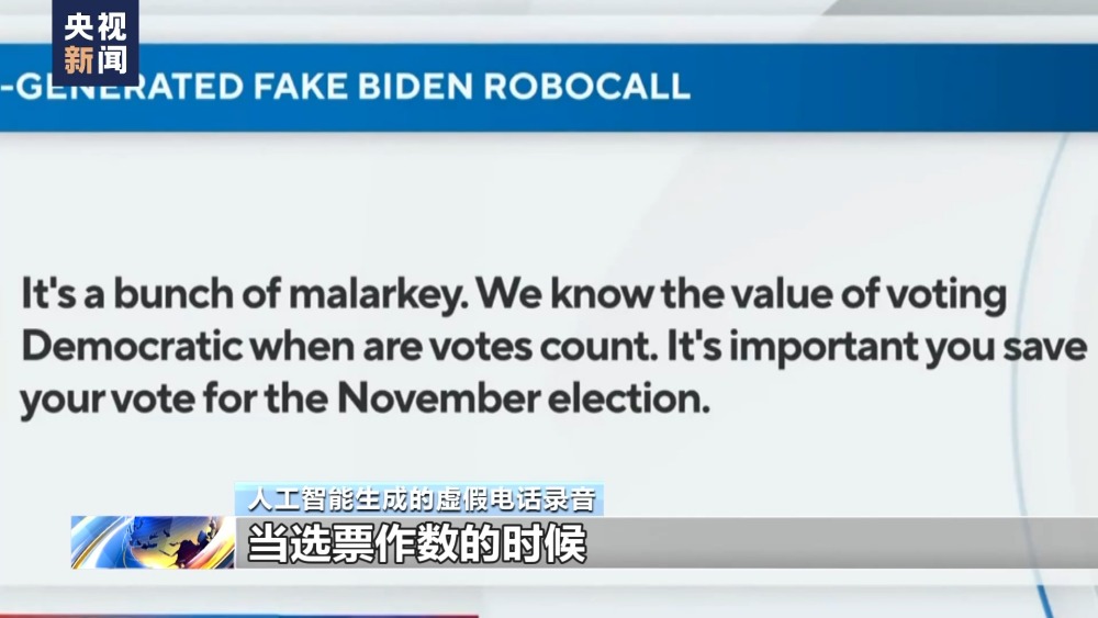 人工智能生成的虛假電話錄音:真是一派胡言,當(dāng)選票作數(shù)的時(shí)候,我們就能知道民主投票的價(jià)值了。你要把選票留到11月再投。