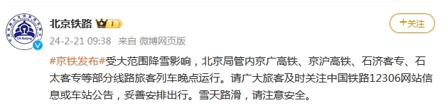 中新網2月21日電 據中國鐵路北京局集團有限公司官方微博消息,受大范圍降雪影響,北京局管內京廣高鐵、京滬高鐵、石濟客專、石太客專等部分線路旅客列車晚點運行。