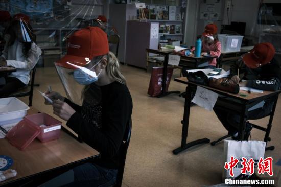 當地時間5月12日,法國中部圣埃蒂安附近的拉格蘭德克羅伊市,當地小學生戴著統一發(fā)放的面罩上課。據報道,當地時間5月11日,法國開始逐步“解封”,結束已經持續(xù)55天的全國“封城”狀態(tài)。