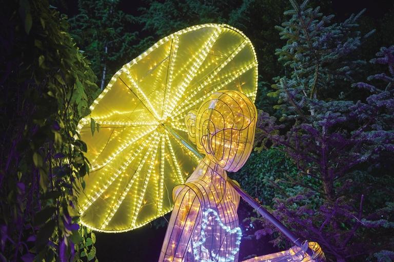 走進燈會現(xiàn)場,仿佛置身于一個夢幻般的世界,各式各樣的花燈錯落有致地分布在公園各個角落,令人目不暇接。宗角祿康公園的走廊里、草坪上,一盞盞精美的燈組在夜色的映襯下顯得更加璀璨奪目,展示出江南煙雨、小橋流水、青磚黛瓦、梅瓶明珠、桃花仙鶴、油傘折扇、上元燈彩等富有江蘇特色的美景雅韻,讓人似乎來到江南水鄉(xiāng),親身感受那一份寧靜與美好。當然,此次燈會最引人矚目的便是“蘇拉一家親”大型燈組,運用拉薩經(jīng)典配色搭建飄逸的彩帶雙翼,再搭配拉薩的吉祥物牦牛和江蘇的吉祥物麋鹿,充分表達了“蘇拉一家親,攜手向未來”的寓意。