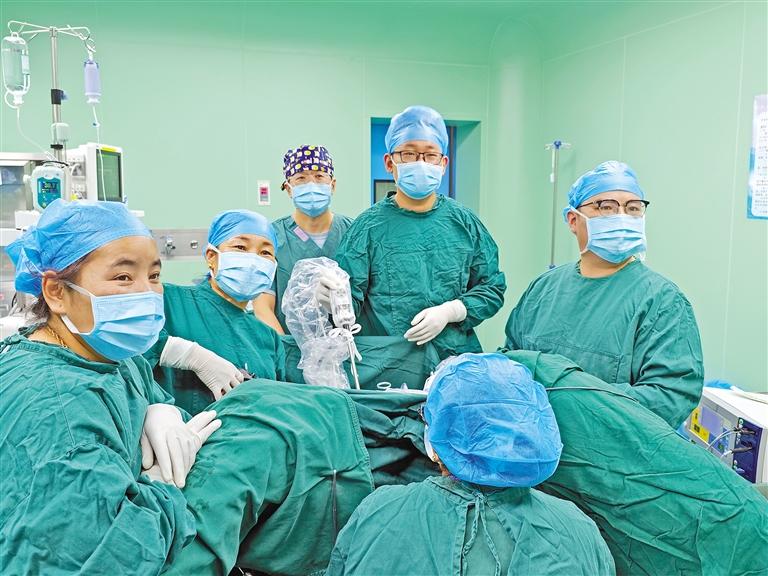上海援藏醫(yī)療專家隋孟松(右一)帶領本地婦科醫(yī)生開展日喀則市首例腹腔鏡下全子宮切除手術。