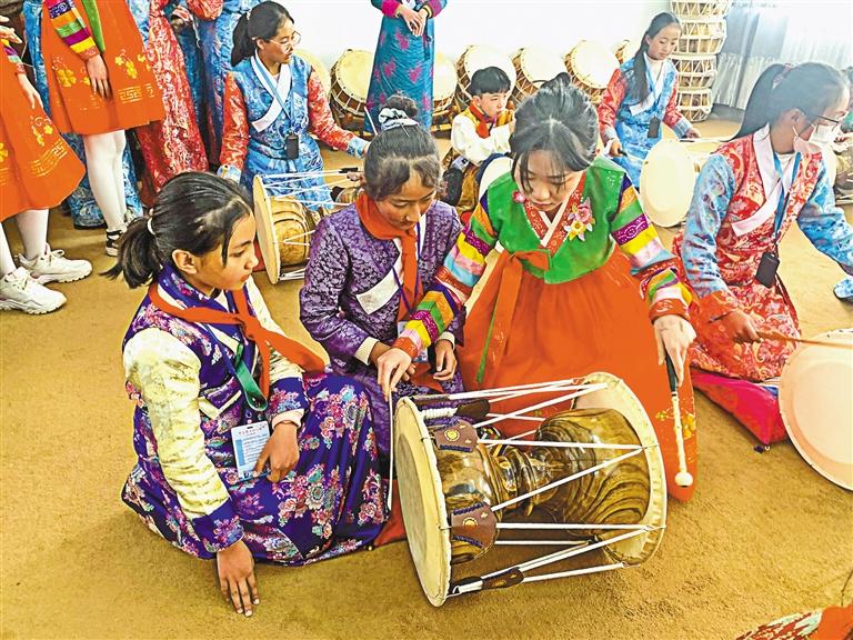 在“吉藏一家親”冬令營(yíng)活動(dòng)中,日喀則學(xué)生在朝鮮族學(xué)生指導(dǎo)下學(xué)習(xí)打鼓。