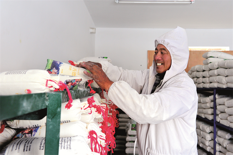 巴桑次仁將生產(chǎn)好的糌粑擺放入庫(kù)。溫凱 攝
