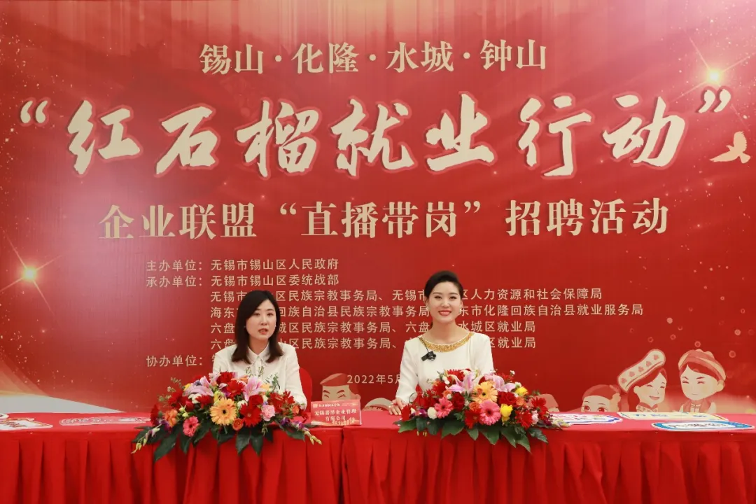 江蘇省無錫市錫山區(qū)與貴州省六盤水市水城區(qū)、鐘山區(qū),青海省海東市化隆回族自治縣通過網(wǎng)絡(luò)平臺舉行“紅石榴就業(yè)行動(dòng)”合作簽約暨企業(yè)聯(lián)盟“直播帶崗”招聘活動(dòng)。江蘇省民族宗教事務(wù)委員會(huì)供圖