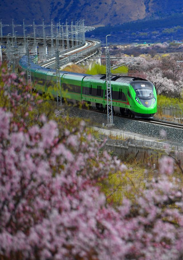 2023年3月21日,復(fù)興號(hào)列車穿行在西藏拉林鐵路林芝段的桃花間。新華社記者 覺果 攝