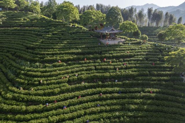 浙江省景寧畬族自治縣以國(guó)家民委“共同現(xiàn)代化試點(diǎn)”為抓手,積極促進(jìn)農(nóng)文旅融合發(fā)展。圖為2021年4月30日,參賽隊(duì)員在景寧縣澄照鄉(xiāng)三石村惠明茶園參加采茶比賽(無人機(jī)照片)。新華社發(fā)(李肅人 攝)