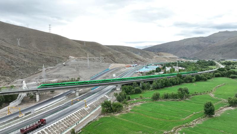 6月30日,G4218雅安至葉城國家高速公路拉薩至日喀則機(jī)場段項(xiàng)目建成通車。圖為318國道 、拉日鐵路 、拉日高等級公路 交錯并行。記者 索朗群培 次旦央吉 扎西頓珠
