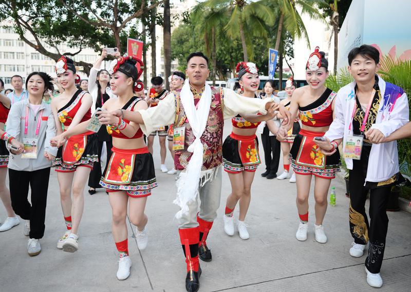 11月22日,由國家民委和國家體育總局主辦、海南省人民政府承辦的第十二屆全國少數(shù)民族傳統(tǒng)體育運(yùn)動會在海南三亞開幕。圖為第十二屆全國少數(shù)民族傳統(tǒng)體育運(yùn)動會西藏代表團(tuán)民族健身操運(yùn)動員賽后與福建代表團(tuán)運(yùn)動員一起跳鍋莊。