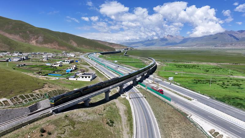 1954年12月25日川藏、青藏公路同時通車?yán)_,西藏日報聯(lián)合四川日報、青海日報開展的“大道向前 天路放歌——紀(jì)念‘兩路’建成通車70周年”聯(lián)合采訪。圖為記者在拉薩當(dāng)雄縣境內(nèi)用無人機(jī)拍攝的青藏公路、青藏鐵路、京藏高速公路三路同框照。西藏日報青海日報青藏線聯(lián)合報道組攝