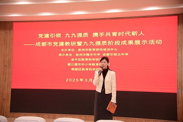 陽(yáng)春三月,齊聚彭州共教研。為全面貫徹落實(shí)黨的二十屆三中全會(huì)和全國(guó)教育大會(huì)精神,系統(tǒng)推進(jìn)黨的教育方針和黨中央決策部署在中小學(xué)得到貫徹落實(shí),堅(jiān)持“為黨育人、為國(guó)育才”。3月25日下午,彭州市隆豐中學(xué)開展成都市黨建教研暨“九九提質(zhì)”階段成果展示活動(dòng)。