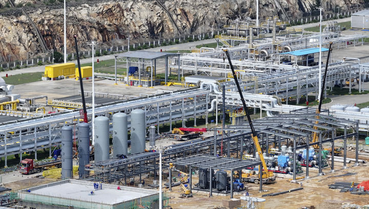 這是2024年6月21日拍攝的位于珠海經(jīng)濟(jì)開發(fā)區(qū)的中海石油深海開發(fā)有限公司二氧化碳回收利用項目塔器安裝現(xiàn)場。新華社發(fā)(邱婷 攝)