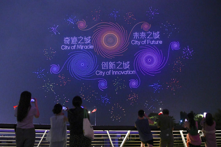 2024年9月26日,市民、游客在深圳灣觀看廣東深圳大漠大智控技術(shù)有限公司呈現(xiàn)的無人機(jī)編隊表演。新華社記者 梁旭 攝