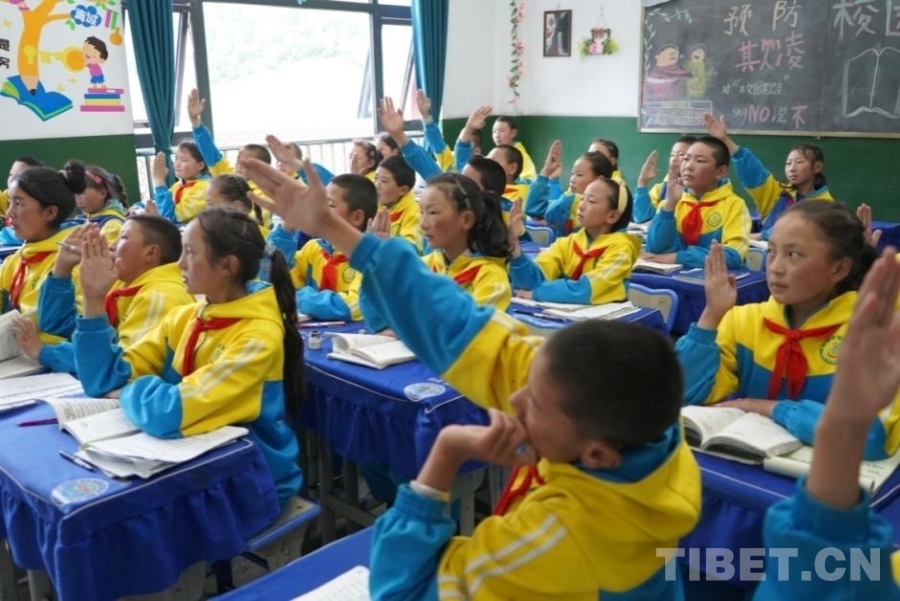 圖為那曲市索縣西昌鄉(xiāng)小學(xué)學(xué)生在課堂上舉手回答問題 攝影:吳建穎