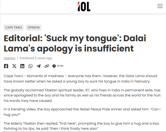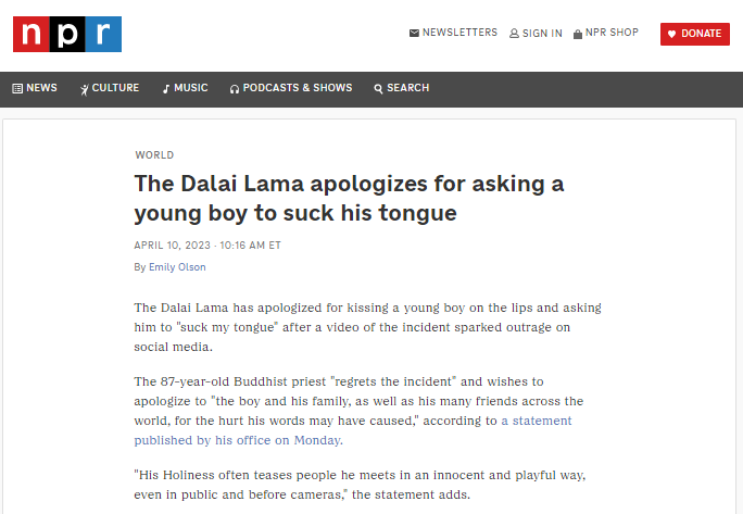 要求印度男孩“吸我的舌頭”。“美國(guó)國(guó)家公共電臺(tái)”2023年報(bào)道稱,當(dāng)年2月達(dá)賴在一場(chǎng)公開活動(dòng)中擁抱了一名印度男孩,并要求他“吸我的舌頭”,男孩慢慢把頭靠近達(dá)賴,但似乎只是碰了一下達(dá)賴的額頭就縮了回去。南非《水星報(bào)》報(bào)道稱,十四世達(dá)賴作為精神領(lǐng)袖,比任何人都懂得道歉和寬恕,但道歉并不能免除他為自己的行為承擔(dān)后果。十四世達(dá)賴對(duì)無辜男孩做出的反常行為,已經(jīng)證明了他只不過是一個(gè)變態(tài)的、“墮落”的人。