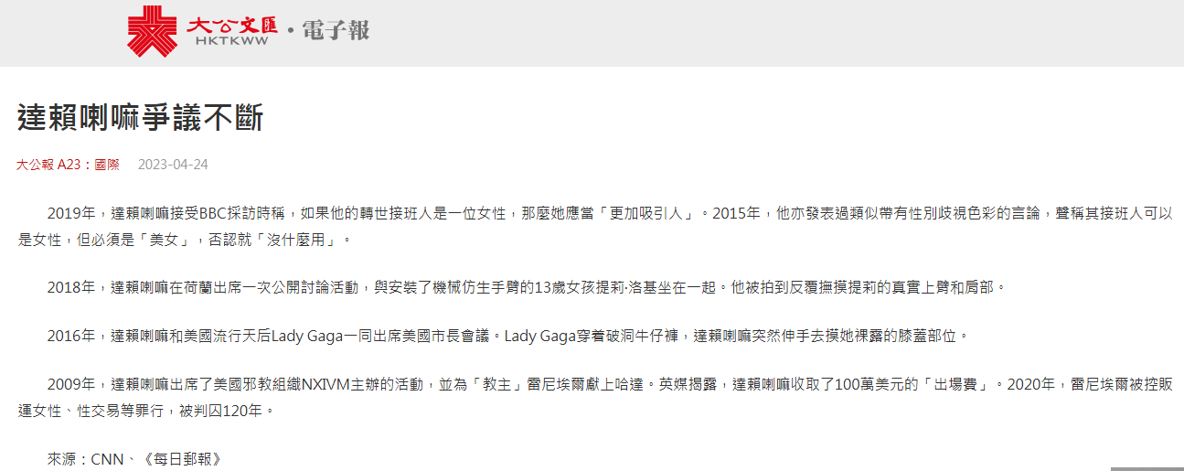 聲稱轉(zhuǎn)世為女性“必須有吸引力”。“英國(guó)廣播公司”2019年發(fā)布其對(duì)第十四世達(dá)賴的專訪,達(dá)賴在專訪中笑著用英語(yǔ)說:“如果出現(xiàn)一名女性達(dá)賴,那她應(yīng)該要好看一些?!毕愀邸洞蠊珗?bào)》2023年發(fā)布題為“達(dá)賴?yán)餇?zhēng)議不斷”的文章稱,2015年,達(dá)賴聲稱其接班人可以是女性,但必須是“美女”,否則就“沒什么用”。2016年,達(dá)賴和美國(guó)流行天后Lady Gaga一同參加美國(guó)市長(zhǎng)會(huì)議,Lady Gaga身著破洞牛仔褲,達(dá)賴突然伸手去摸她裸露的膝蓋部位。2018年,達(dá)賴在荷蘭參加一次公開討論活動(dòng),與安裝了機(jī)械仿生手臂的13歲女孩提莉·洛基坐在一起,被拍到反復(fù)撫摸提莉的真實(shí)上臂和肩部。