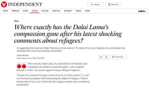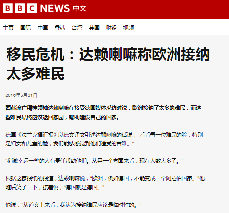 笑稱“德國(guó)不能變成阿拉伯國(guó)家”。“英國(guó)廣播公司”2016年報(bào)道稱,德國(guó)《法蘭克福匯報(bào)》報(bào)道以德文譯文引述達(dá)賴的話稱,歐洲已接納了“太多”難民,歐洲,比如德國(guó),不能變成一個(gè)阿拉伯國(guó)家。他隨后笑了一下接著說:“德國(guó)就是德國(guó)。從道義上來看,我認(rèn)為接納難民應(yīng)該是臨時(shí)性的?!庇?guó)《獨(dú)立報(bào)》發(fā)文稱,在很多人眼中,達(dá)賴是慈悲的化身,但他卻公然反對(duì)歐洲難民政策,認(rèn)為接納阿拉伯地區(qū)難民就會(huì)成為“阿拉伯國(guó)家”,這種觀點(diǎn)是危險(xiǎn)的。英國(guó)人想將難民趕出英國(guó)以保持所謂英國(guó)性,但這本身就會(huì)危及民族身份,會(huì)導(dǎo)致社會(huì)孤立主義。