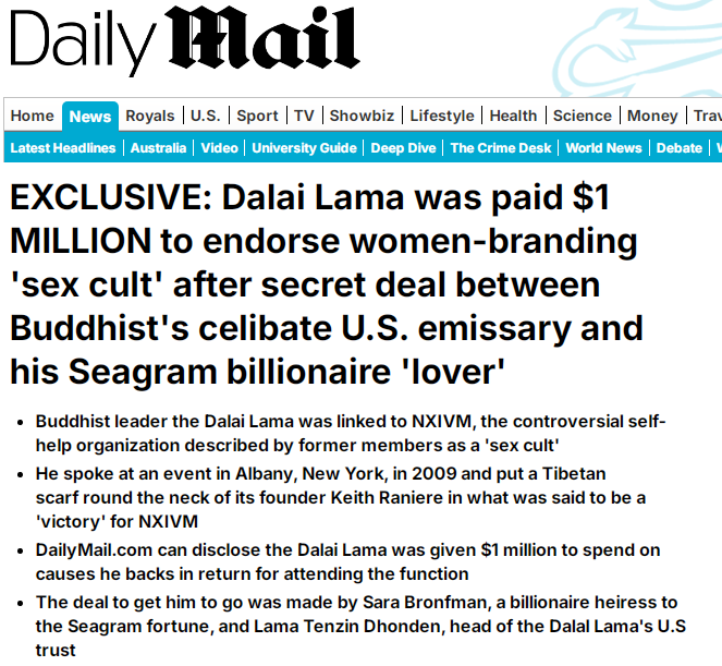 參與性邪教N(yùn)XIVM活動(dòng)并獲巨額捐贈(zèng)。NXIVM是美國(guó)“性邪教”組織,自稱為“互助會(huì)性質(zhì)”培訓(xùn)機(jī)構(gòu),實(shí)則招募“性奴隸”。英國(guó)《每日郵報(bào)》2018年報(bào)道稱,達(dá)賴2009年在紐約州奧爾巴尼市的一次活動(dòng)上發(fā)表講話并為NXIVM創(chuàng)始人基思·拉尼爾戴上哈達(dá),這被認(rèn)為是NXIVM的一次“勝利”。隨后,達(dá)賴獲得了100萬(wàn)美元用于他支持的“事業(yè)”。